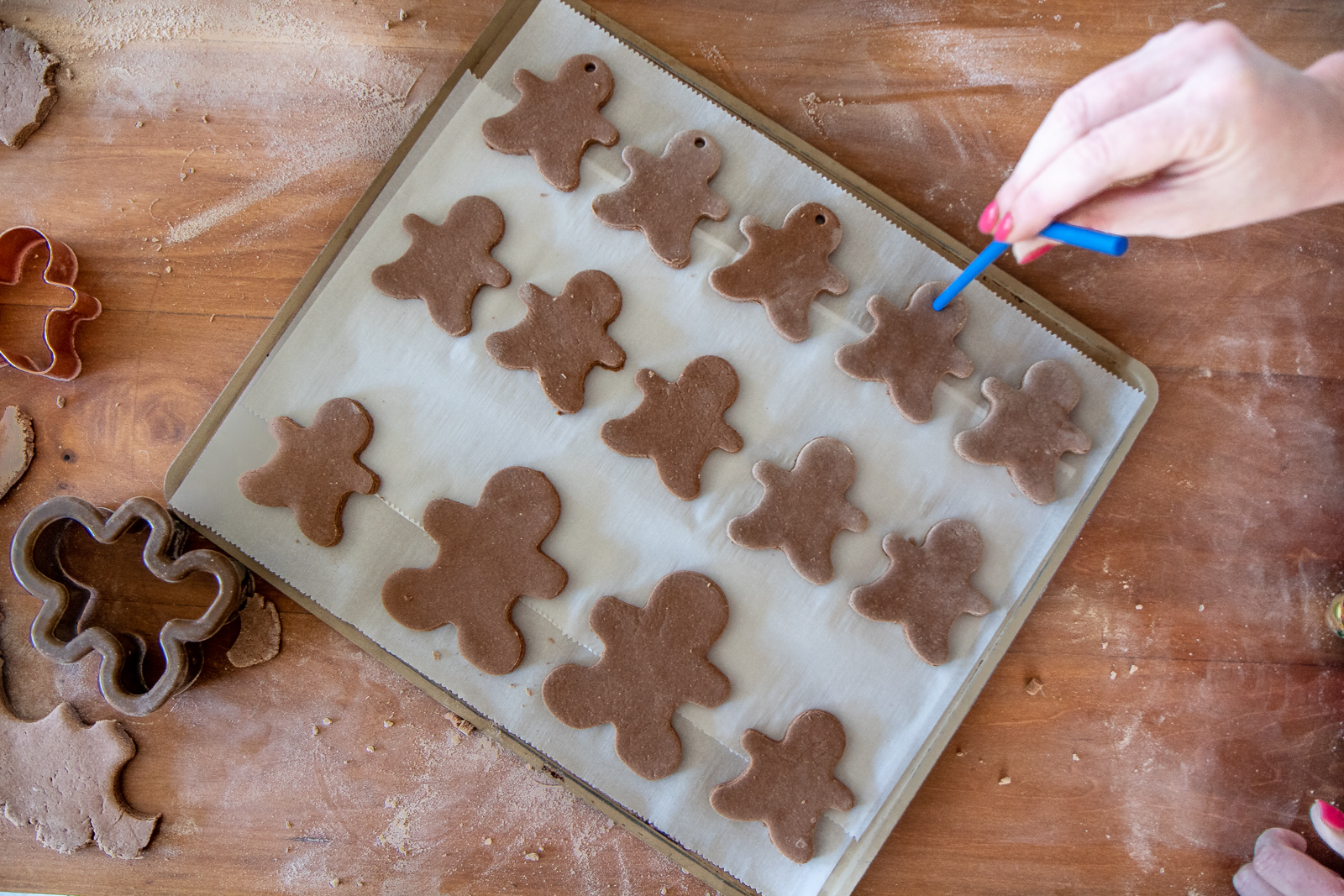 Grab a straw and poke holes in each ornament, the straw creates a perfect uniform hole. A straw can quickly clog up with dough so a trick I’ve learned is to blow the dough out each time. As long as your dough wasn’t rolled too thick it’s easy to do. You can also do holes on each side for stringing garland. I do this with bigger gingerbread.