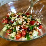 Add chickpeas, tomatoes, cucumber, and olives to a bowl, pour in dressing, and gently mix together.