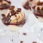 Pour port wine over ice cream, drizzle with chocolate syrup, and top with pecans.
