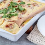 Stir in the onion-spinach mixture and mix well. Pour into a greased 9x13 baking dish. Top with remaining 1/2 cup of parmesan cheese and bacon.